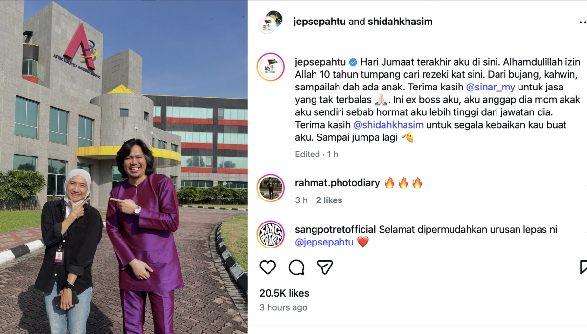 “Hari Jumaat terakhir aku di sini. Alhamdulillah izin Allah 10 tahun tumpang cari rezeki kat sini. Dari bujang, kahwin, sampailah dah ada anak. Terima kasih Sinar FM untuk jasa yang tak terbalas,” tulisnya.