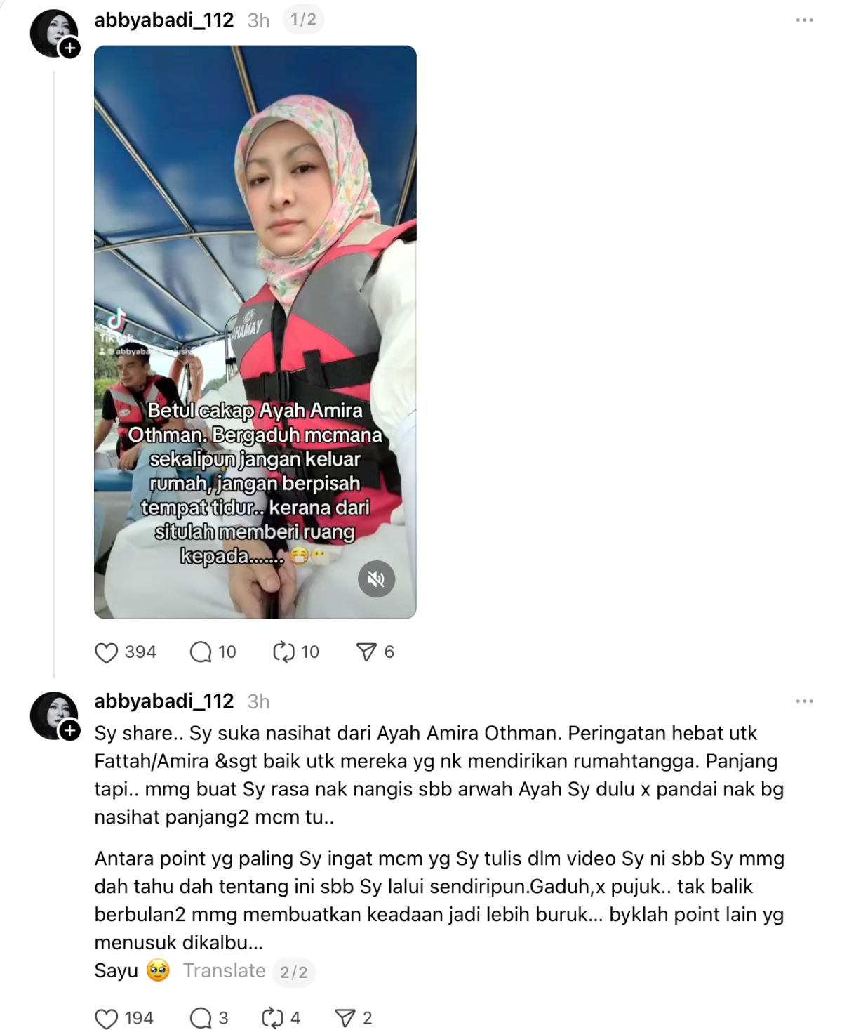 Menerusi perkongsian di Threads, Abby berkata dia menangis mendengar ucapan bapa Amira serta mengatakan jika pasangan suami isteri bergaduh sebaiknya berusaha untuk selesaikan masalah.