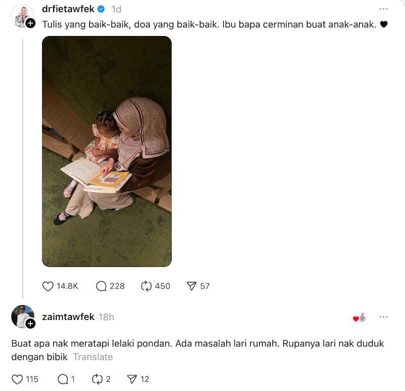 Difahamkan, Zaim meninggalkan komen berkenaan dalam satu hantaran Dr Afifah yang memohon orang ramai mendoakan yang baik-baik serta ibu bapa adalah cerminan buat anak-anak.
