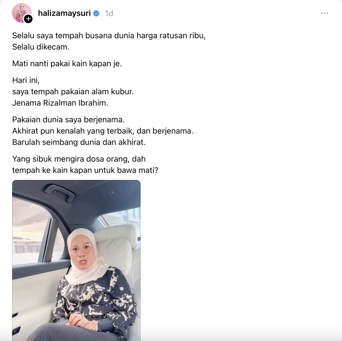 Menerusi hantaran di Threads, Haliza berkata dia sering dikecam apabila ada netizen mengatakan apabila meninggal dunia kelak hanya kain kafan yang akan dipakai.