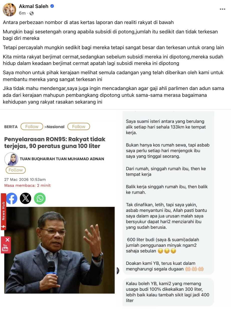 Menurutnya, terdapat jurang ketara antara data rasmi dan realiti sebenar di peringkat akar umbi, apabila kesan penyelarasan subsidi mungkin dilihat kecil bagi sesetengah pihak tetapi memberi impak besar kepada rakyat yang bergelut memenuhi keperluan asas.