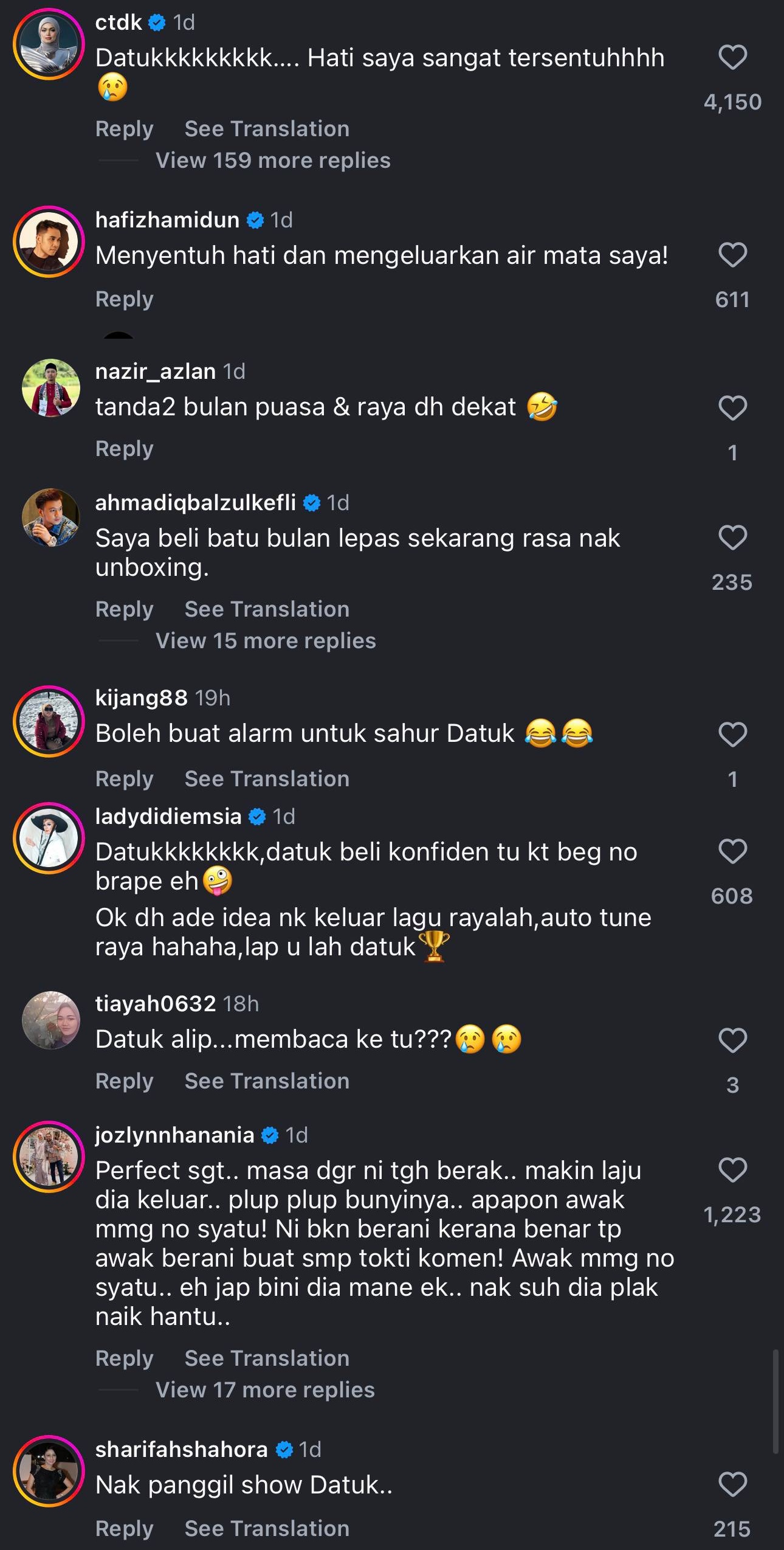 Lebih menghiburkan, isteri kepada pelawak Johan iaitu Ozlynn turut meninggalkan komen serta mengatakan Aliff mempunyai keberanian sehingga Biduanita Negara turut memberiAliff Syukri Kongsi Teaser Lagu Raya, Siti Nurhaliza Komen “Hati Saya Sangat Tersentuh” kan komen.