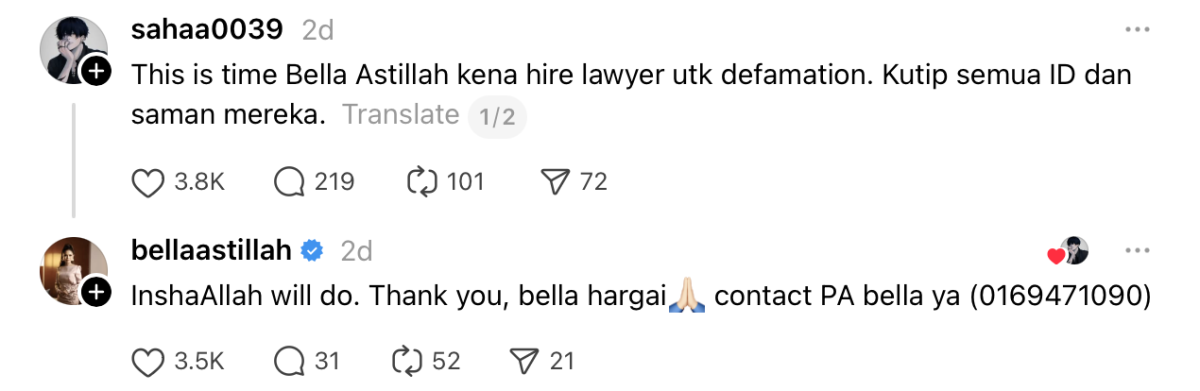 “Kali ini Bella kena lantik peguam untuk kes fitnah. Kutip semua ID dan saman mereka,” tulis seorang netizen Insya-Allah akan buat (fail saman fitnah). Terima kasih, saya hargai,” tulis Bella.