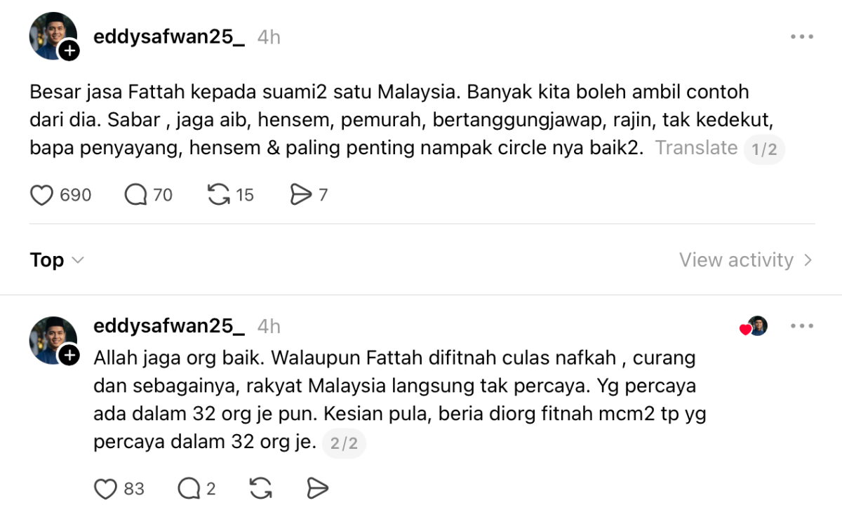 “Besar jasa Fattah kepada suami-suami satu Malaysia. Banyak kita boleh ambil contoh dari dia. Sabar, jaga aib, hensem, pemurah, bertanggungjawap, rajin, tak kedekut, bapa penyayang, hensem & paling penting nampak circle nya baik-baik,” tulisnya.