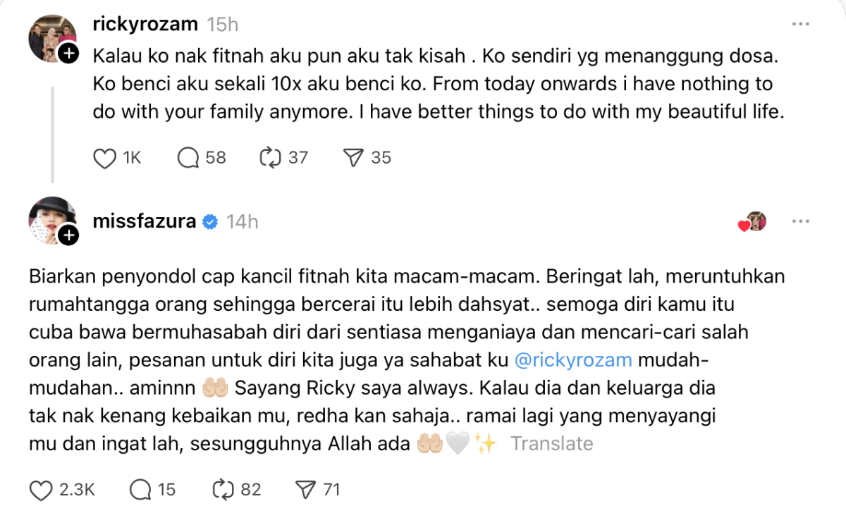 Menerusi hantaran di Threads, Fazura meminta wanita itu tidak pedulikan kata-kata fitnah dilemparkan serta mengatakan  perbuatan memfitnah serta meruntuhkan rumah tangga sehingga bercerai adalah perkara tidak baik.