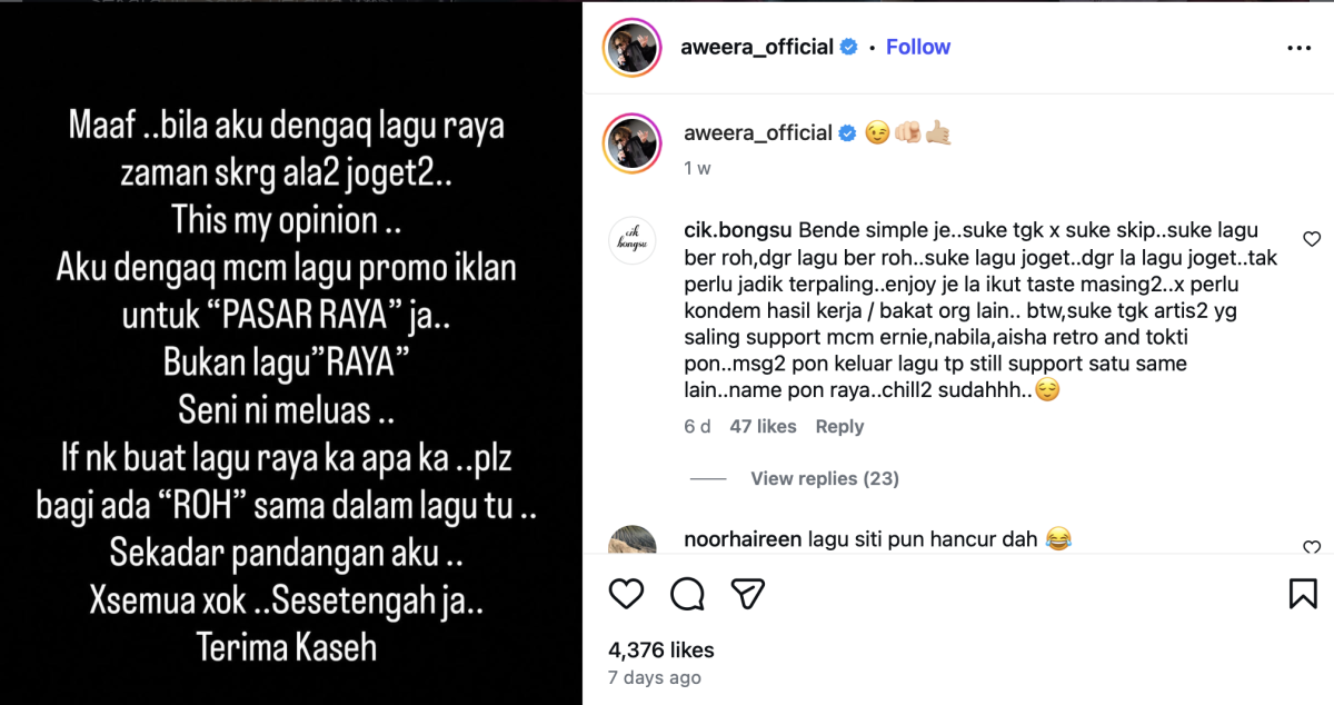 Menerusi perkongsian di Instagram, Aweera berkata sesetengah lagu raya zaman sekarang berentak joget serta di dengar seperti lagu promosi dan bukan lagu ‘raya’.
