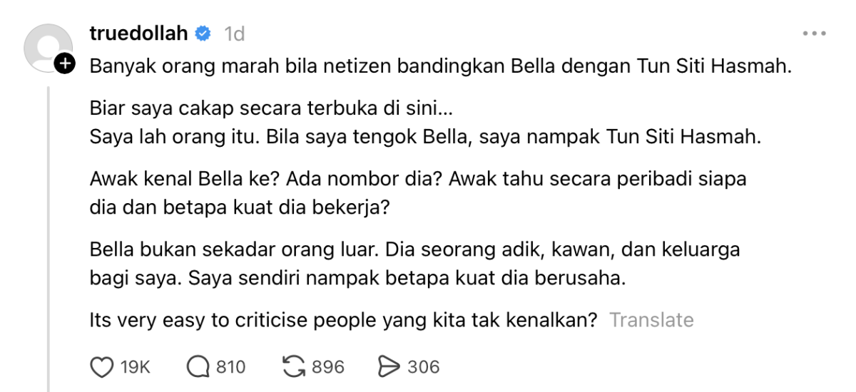 “Ramai orang marah apabila netizen membandingkan Bella dengan Tun Siti Hasmah.