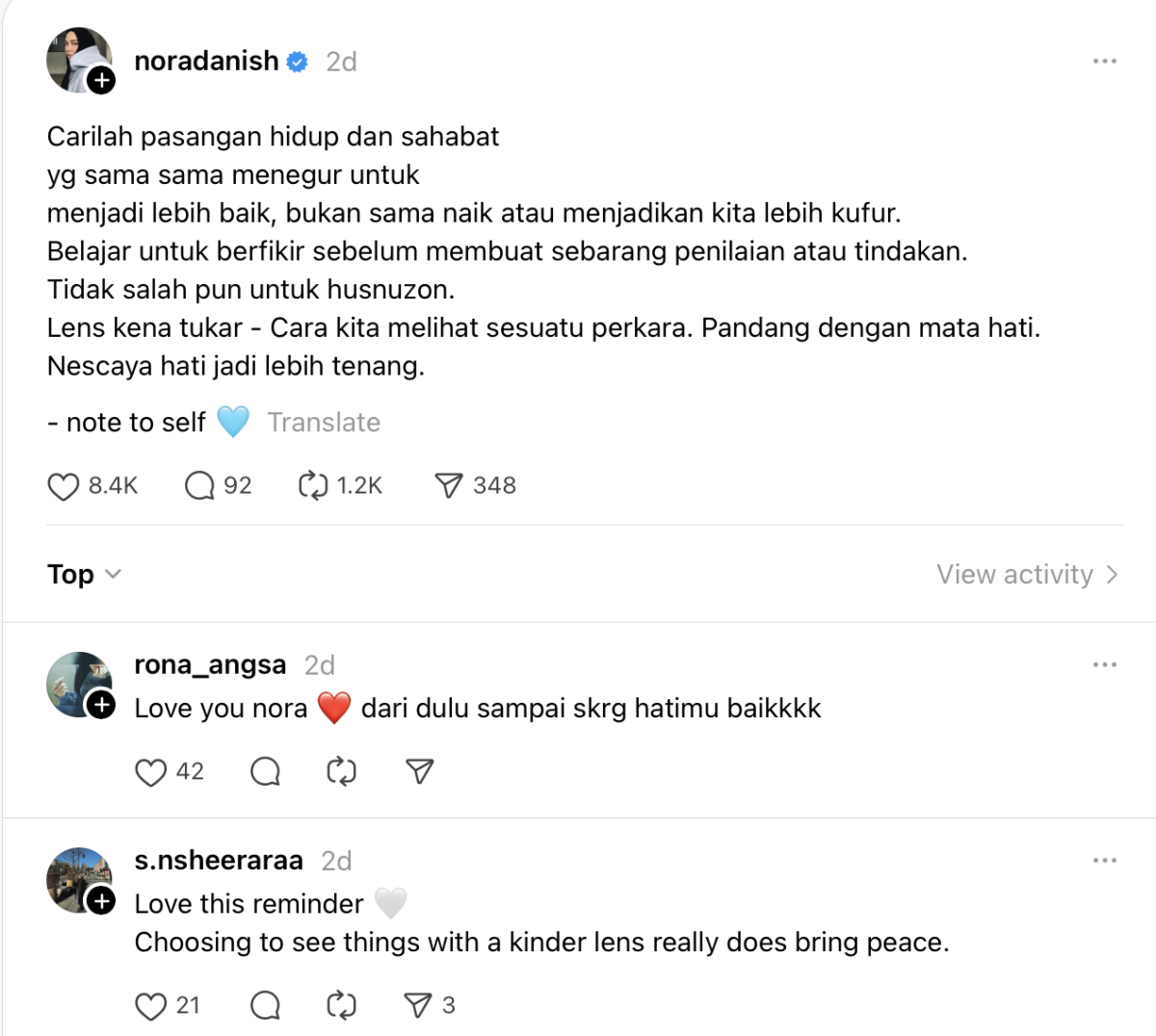 Menerusi hantaran di Threads, Nora turut memberi peringatan kepada dirinya untuk berfikir sebelum membuat sebarang penilaian atau tindakan.