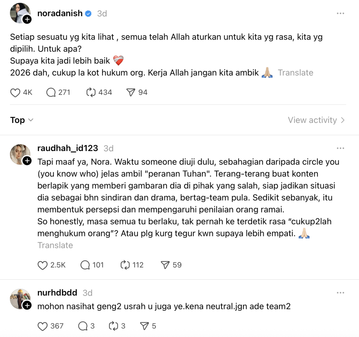 Perkongsian Nora itu mendapat pelbagai reaksi daripada netizen yang bersetuju dengan hantaranya itu namun ada yang meminta Nora untuk menegur rakan-rakan usrah yang didakwa mengambil ‘peranan Tuhan’ dalam isu-isu sebelum ini.
