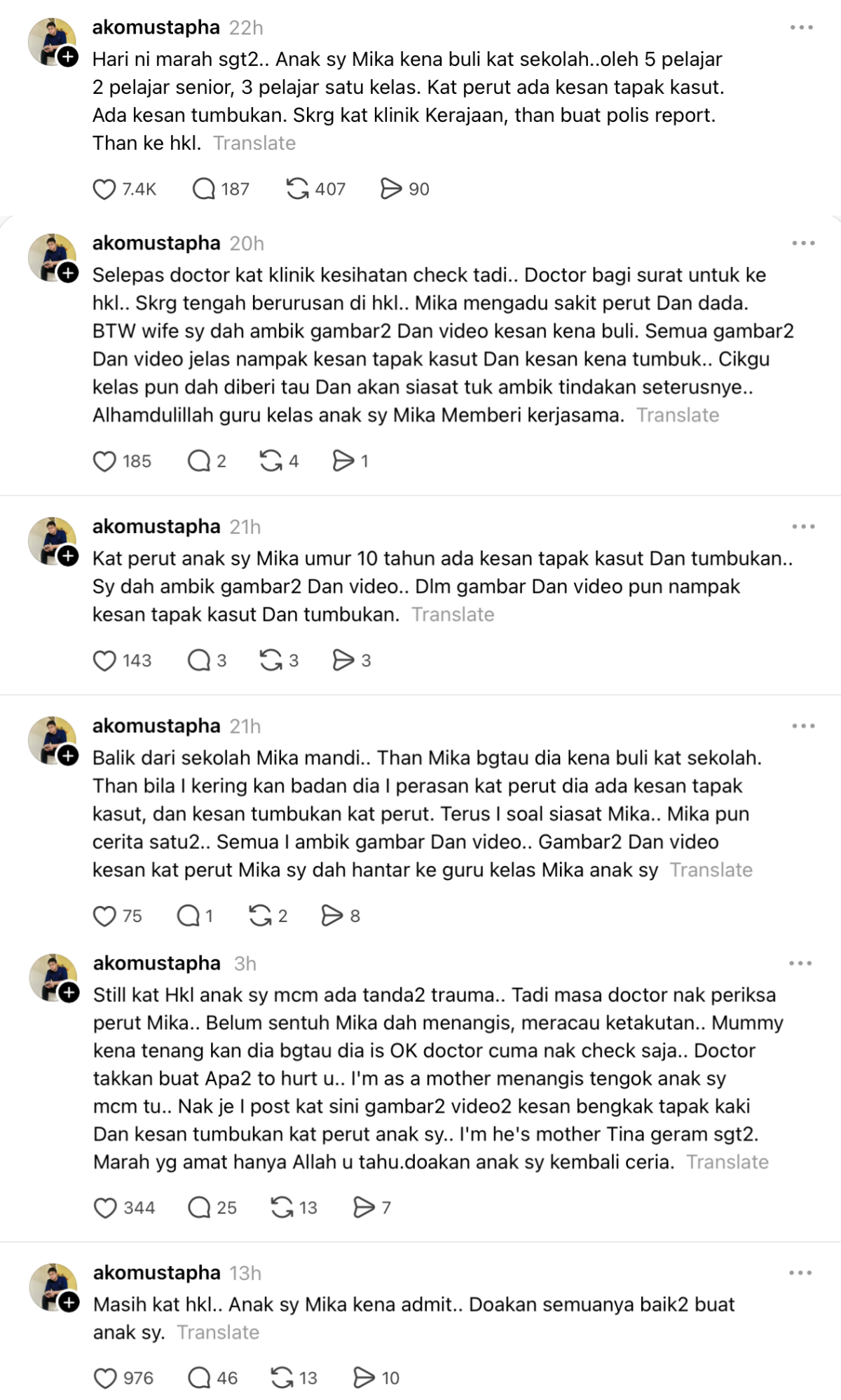 “Terus saya soal siasat Mika. Mika pun cerita satu-satu. Semua saya ambil gambar Dan video.. Gambar dan video kesan dekat perut Mika saya dah hantar ke guru kelas Mika,” tulisnya.