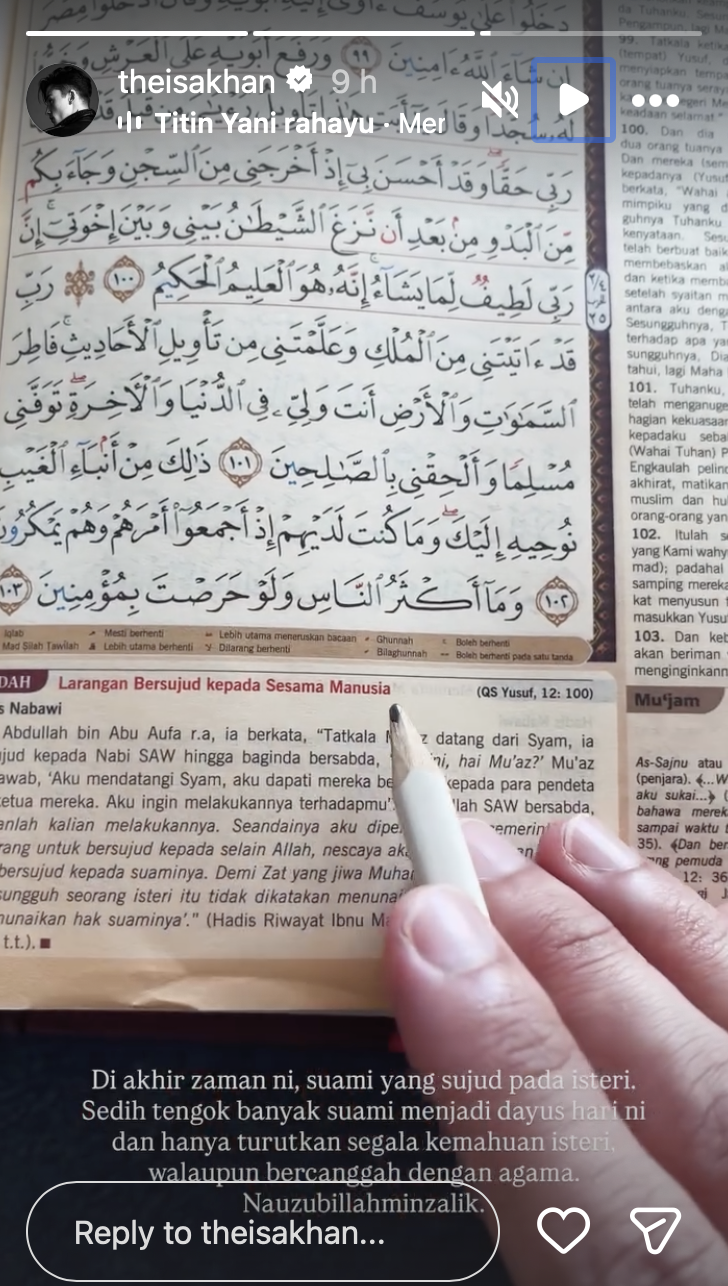 Menerusi hantaran di Insta Story, Isa berkongsikan sedang membaca ayat-ayat suci al-Quran serta larangan bersujud kepada sesama manusia menerusi hadis Nabawi.