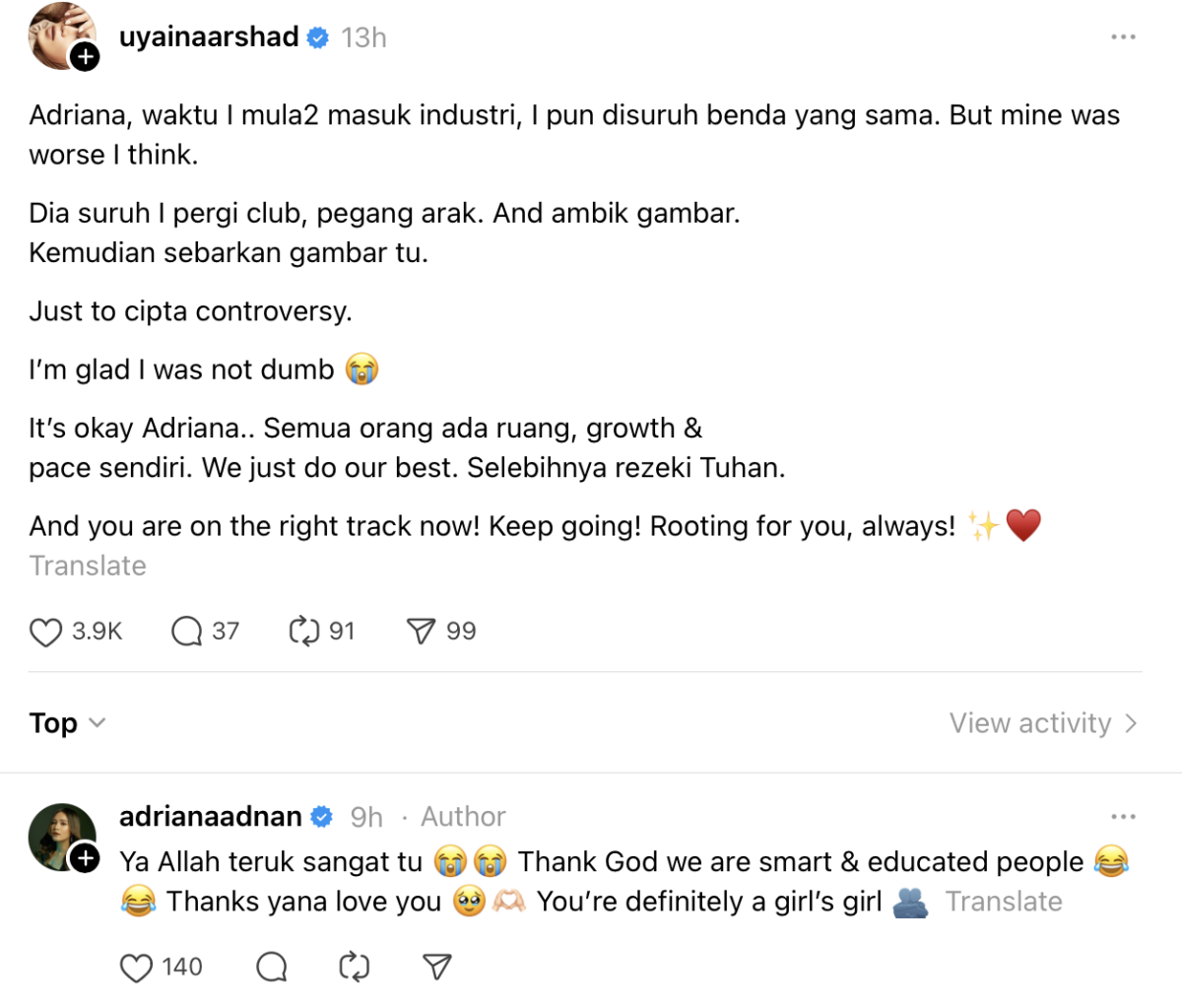 “Adriana, waktu saya mula-mula masuk industri, saya pun disuruh benda yang sama. Tapi saya rasa saya punya lagi teruk. Dia suruh saya pergi club, pegang arak dan ambil gambar. Kemudian sebarkan gambar tu. Hanya untuk cipta kontroversi,” katanya.