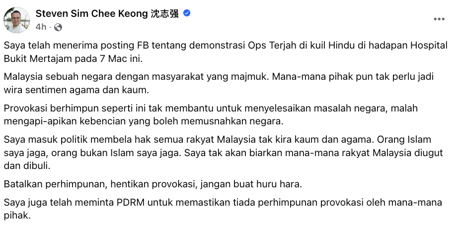 Ahli Parlimen Bukit Mertajam yang juga Menteri Sumber Manusia dan Koperasi (KUSKOP), Steven Sim Chee Keong menggesa supaya perhimpunan ‘Ops Terjah’ yang dirancang di sebuah kuil Hindu berhampiran Hospital Bukit Mertajam pada 7 Mac ini dibatalkan serta-merta.