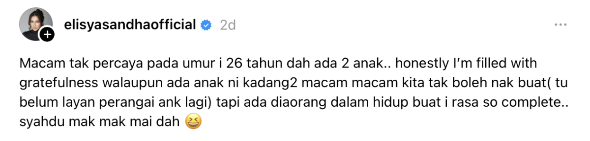 Menerusi satu hantaran di Threads, Elisya berkata dia meluahkan rasa syukur diatas rezeki zuriat meskipun tidak sempat melakukan pelbagai perkara lain namun anak-anak melengkapkan hidupnya.