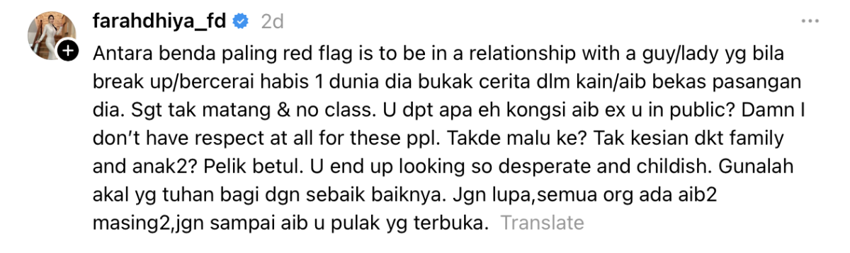 “Antara benda paling red flag ialah apabila seseorang berada dalam hubungan dengan lelaki atau wanita yang bila putus atau bercerai, habis satu dunia dia buka cerita dalam kain, aib bekas pasangan dia.