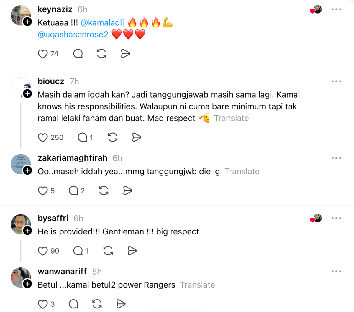 Diruangan komen, rata-rata netizen kagum dengan Kamal yang disifatkan gentleman serta tidak melupakan tanggungjawab apatah lagi bekas isterinya masih dalam idah.