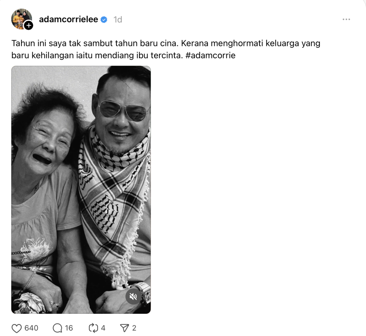 Adam berkongsi khabar duka memaklumkan ibunya telah menghembuskan nafas terakhir pada Disember lalu.