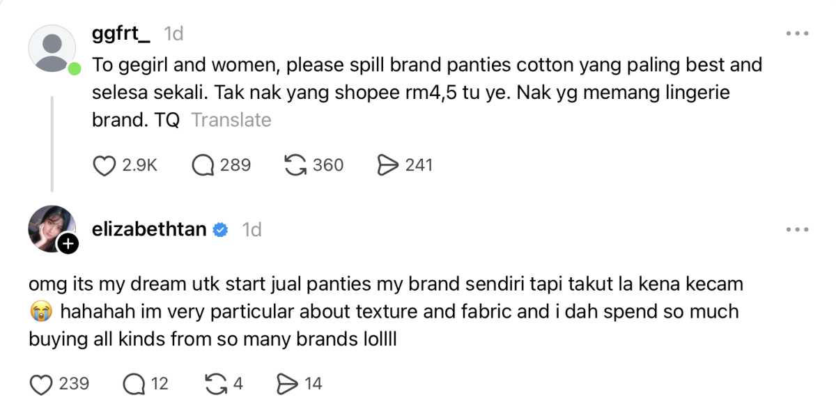 “Impian saya nak jual panties (seluar dalam) jenama sendiri, tapi saya takut la kena kecam,” katanya.