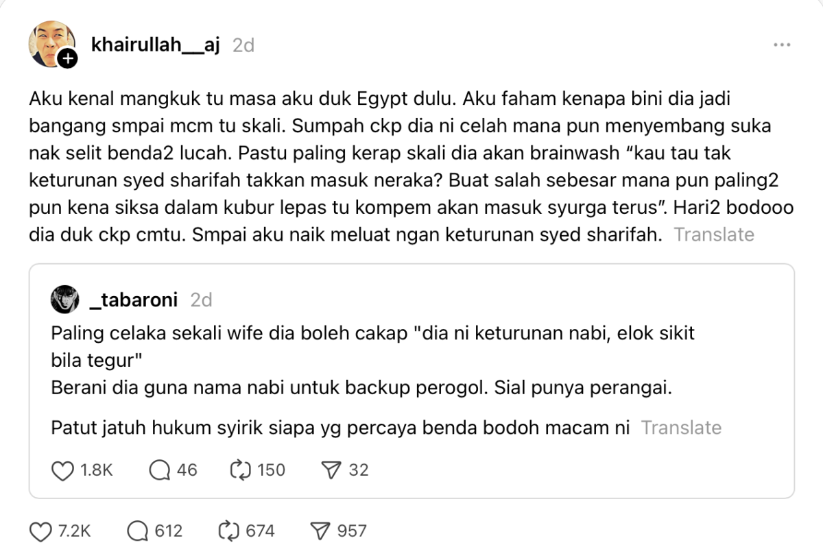 “Paling kerap sekali dia brainwash mengatakan keturunan Syed Sharifah tidak akan masuk neraka.Buat salah besar mana pun kena siksa dalam kubur saja. Lepas itu, akan masuk syurga terus.