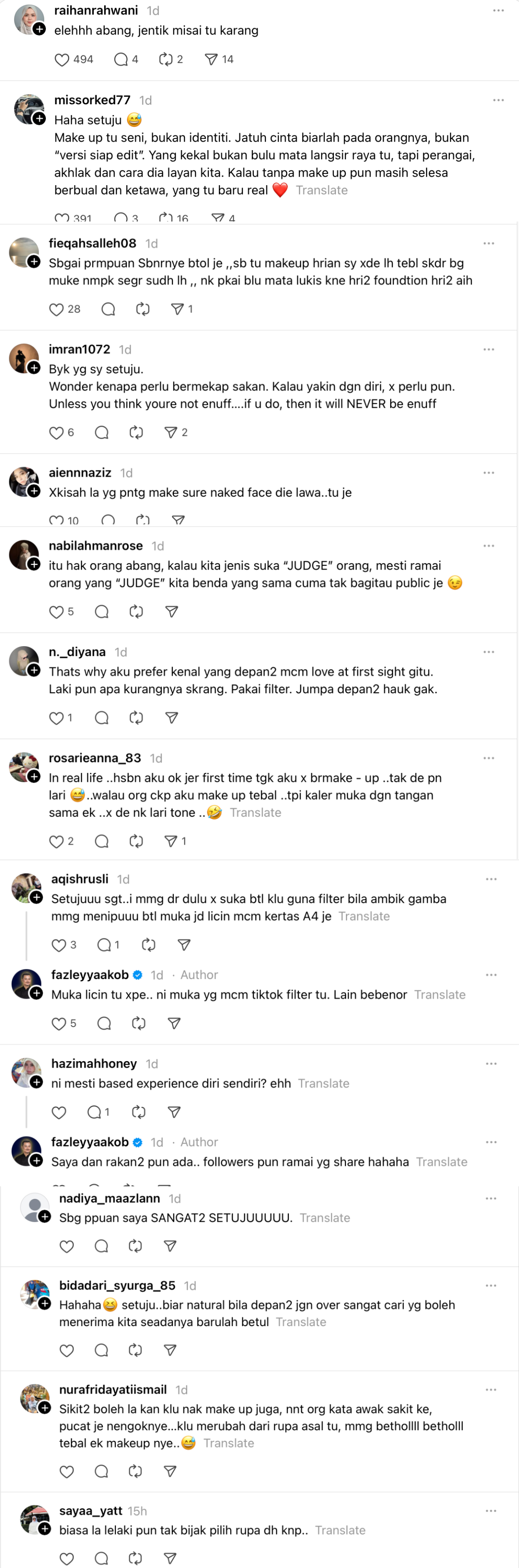 Perkongsian Fazley itu mendapat pelbagai reaksi daripada netizen yang bersetuju dengan kenyataannya itu tidak kurang juga ada yang mengatakan ada di kalangan wanita mengenakan mekap tebal untuk tampil lebih yakin.