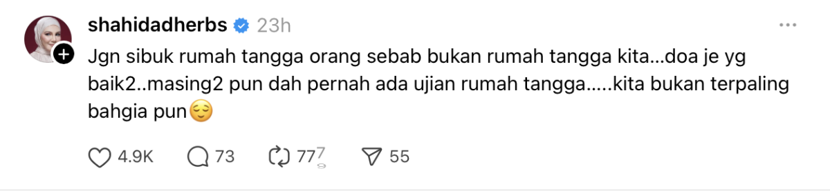 Menerusi perkongsian di Threads, Shahida berkata lebih baik jika kita hanya mendoakan yang baik-baik saja buat mereka yang berdepan masalah rumah tangga.