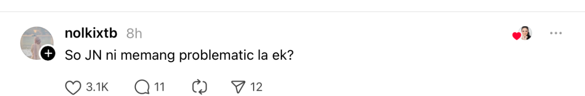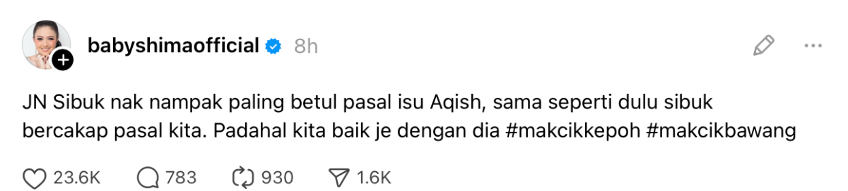 “JN sibuk nak nampak paling betul pasal isu Aqish. Sama seperti dulu, sibuk bercakap pasal kita. Padahal, kita baik saja dengan dia,” tulisnya.