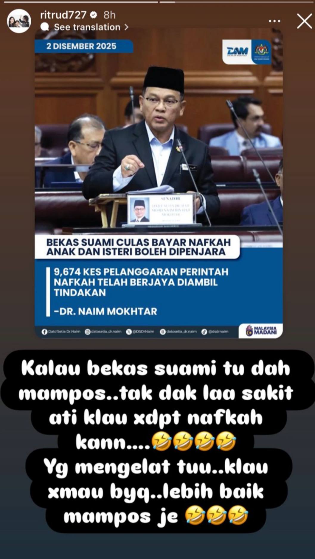 “Kalau bekas suami tu dah nak mampus, tak ada lah sakit hati kalau tak dapat nafkah kan? Yang mengelat tu kalau tak mahu bayar, lebih baik mampus je,” katanya.