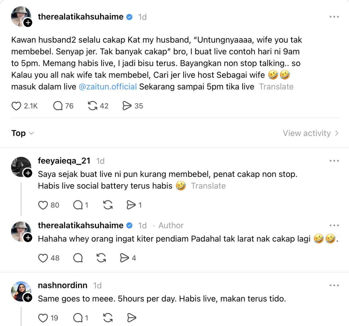 Terhibur dengan kenyataan berkenaan, Atikah berkata setiap hari dia akan membuat live dari pagi hingga ke petang.