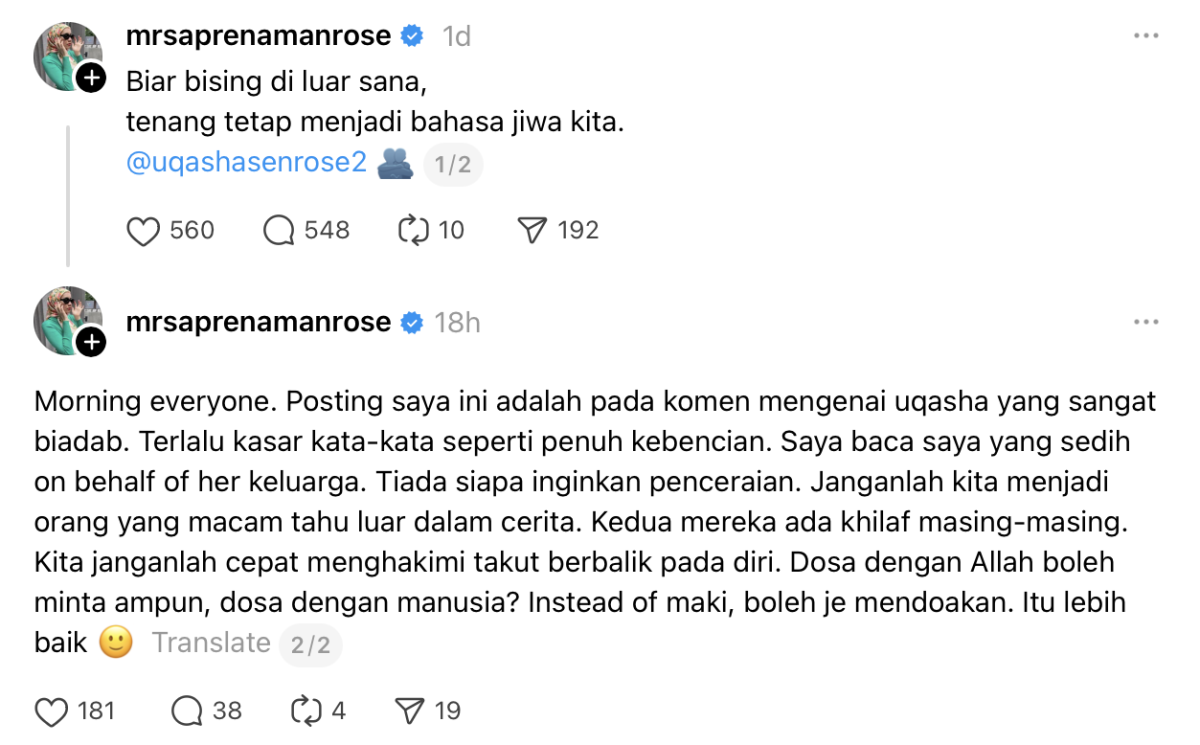 “Saya baca saya yang sedih on behalf of her keluarga. Tiada siapa inginkan penceraian. Janganlah kita menjadi orang yang macam tahu luar dalam cerita,” tulisnya.