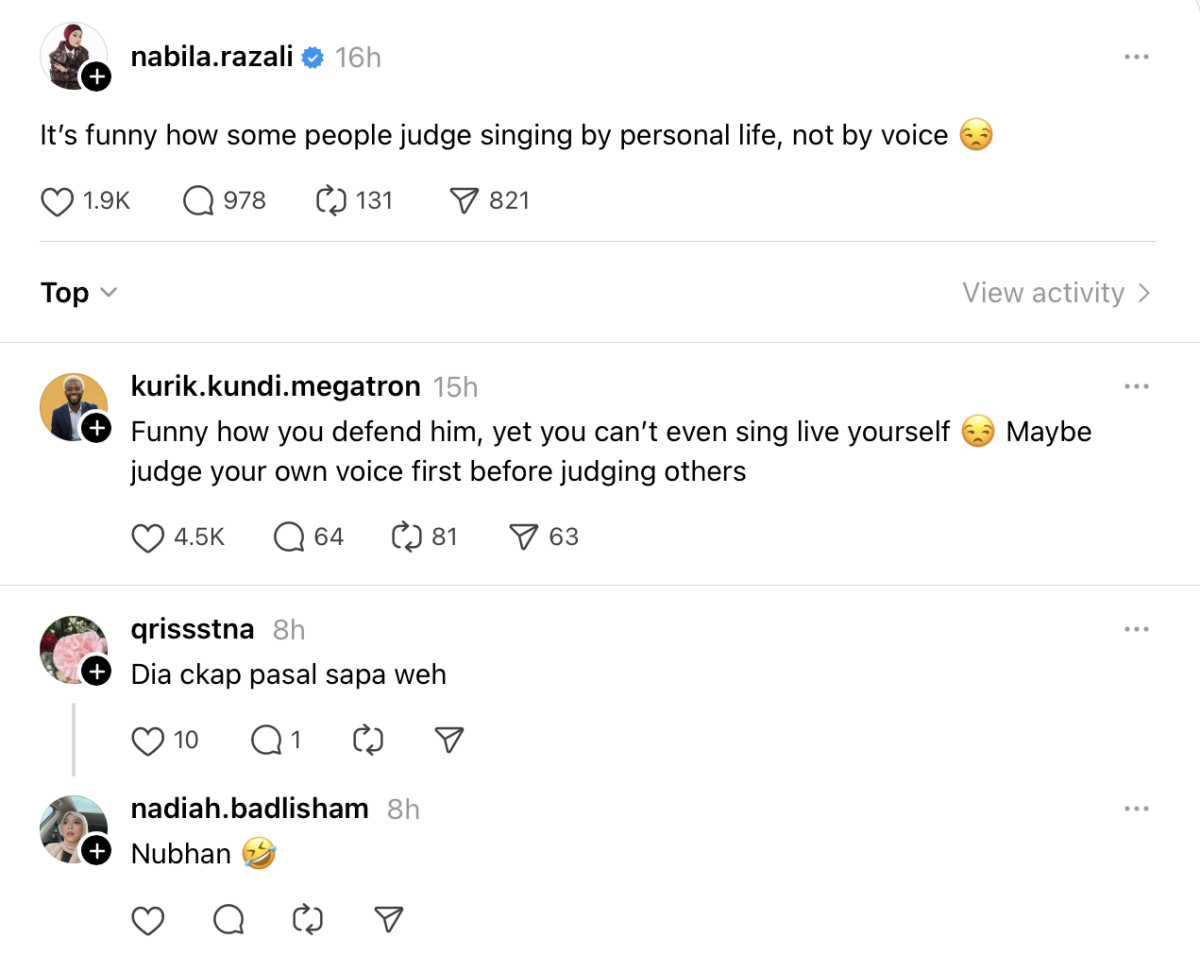 Menerusi satu hantaran di Threads, Nabila berkata nyanyian seseorang sepatutnya bersandarkan pada bakat dan tidak perlu menilai daripada kehidupan peribadinya.