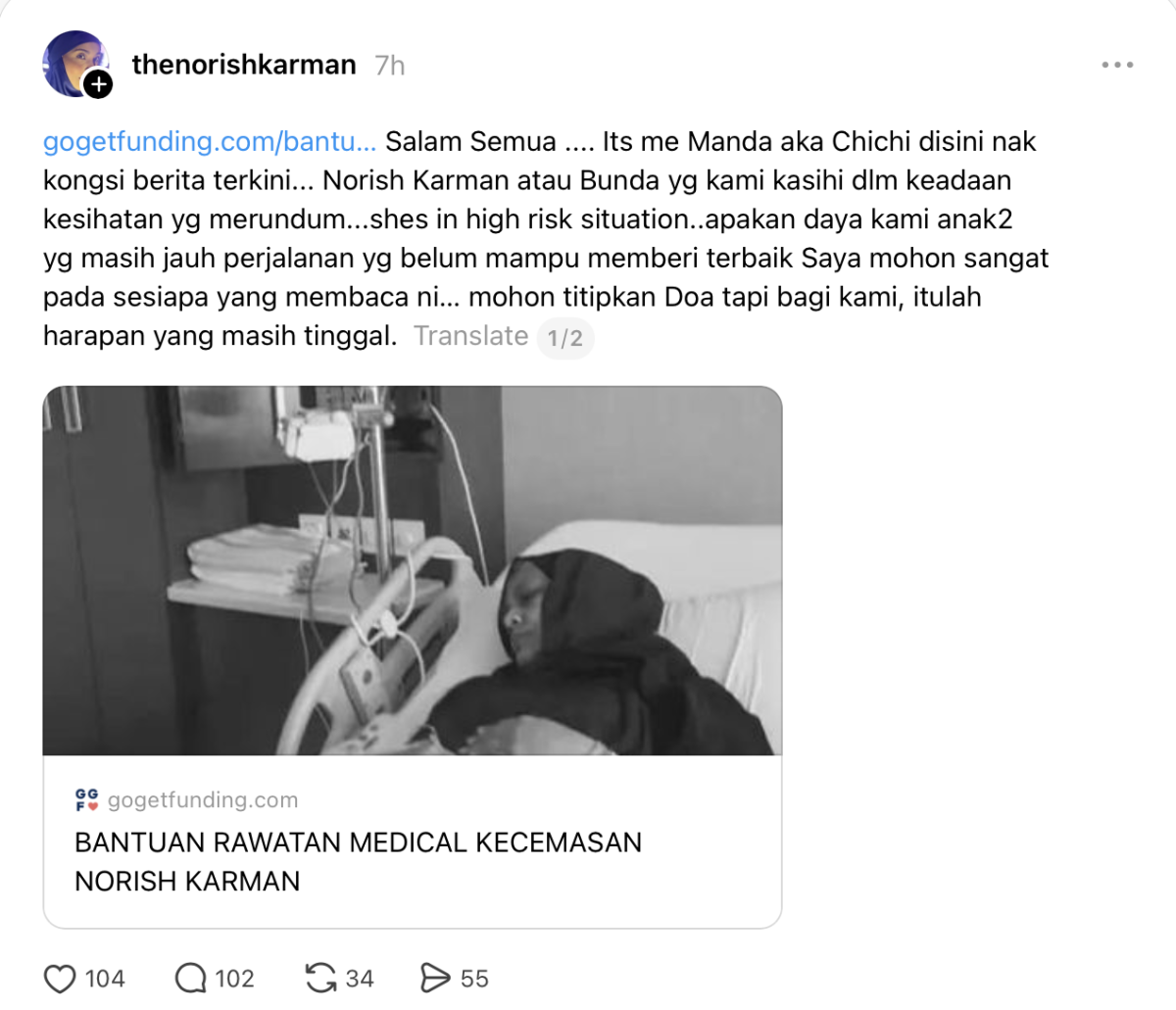 “Doakan agar Allah SWT memberikan Bunda kami peluang untuk mendapatkan rawatan, mengurniakan kesembuhan, dan mengangkat segala kesakitan yang ditanggung oleh NK.