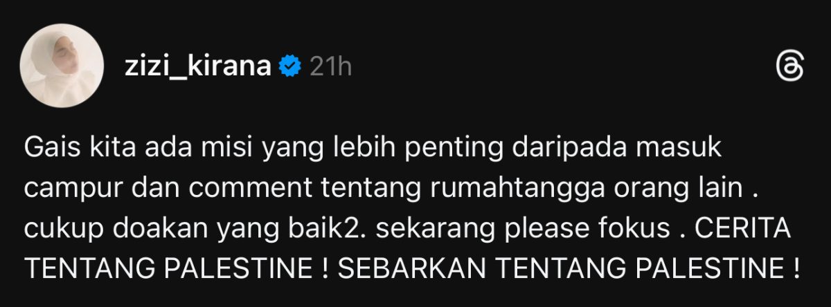 “Cukup doakan yang baik-baik. Sekarang tolong fokus. Cerita tentang Palestin. Sebarkan tentang Palestin!” tulisnya.
