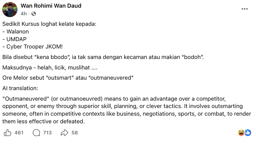 Selepas kenyataan tersebut tular, Wan Rohimi telah berkongsi di media sosial miliknya menyatakan perkataan ‘bbodo’ yang digunakan dalam ucapan tersebut tidak ditujukan sebagai kecaman.