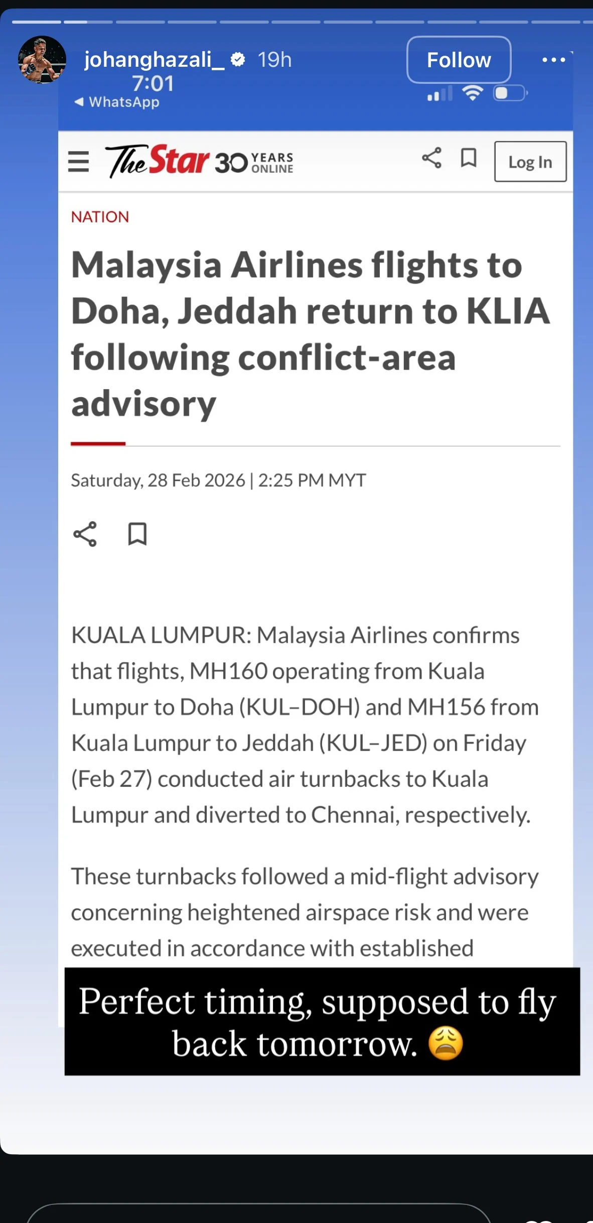 Menerusi perkongsian di Insta Story, Johan atau lebih mesra disapa Jojo berkata dia sepatutnya dijadulkan pulang ke Malaysia semalam selepas menunaikan ibadah umrah.