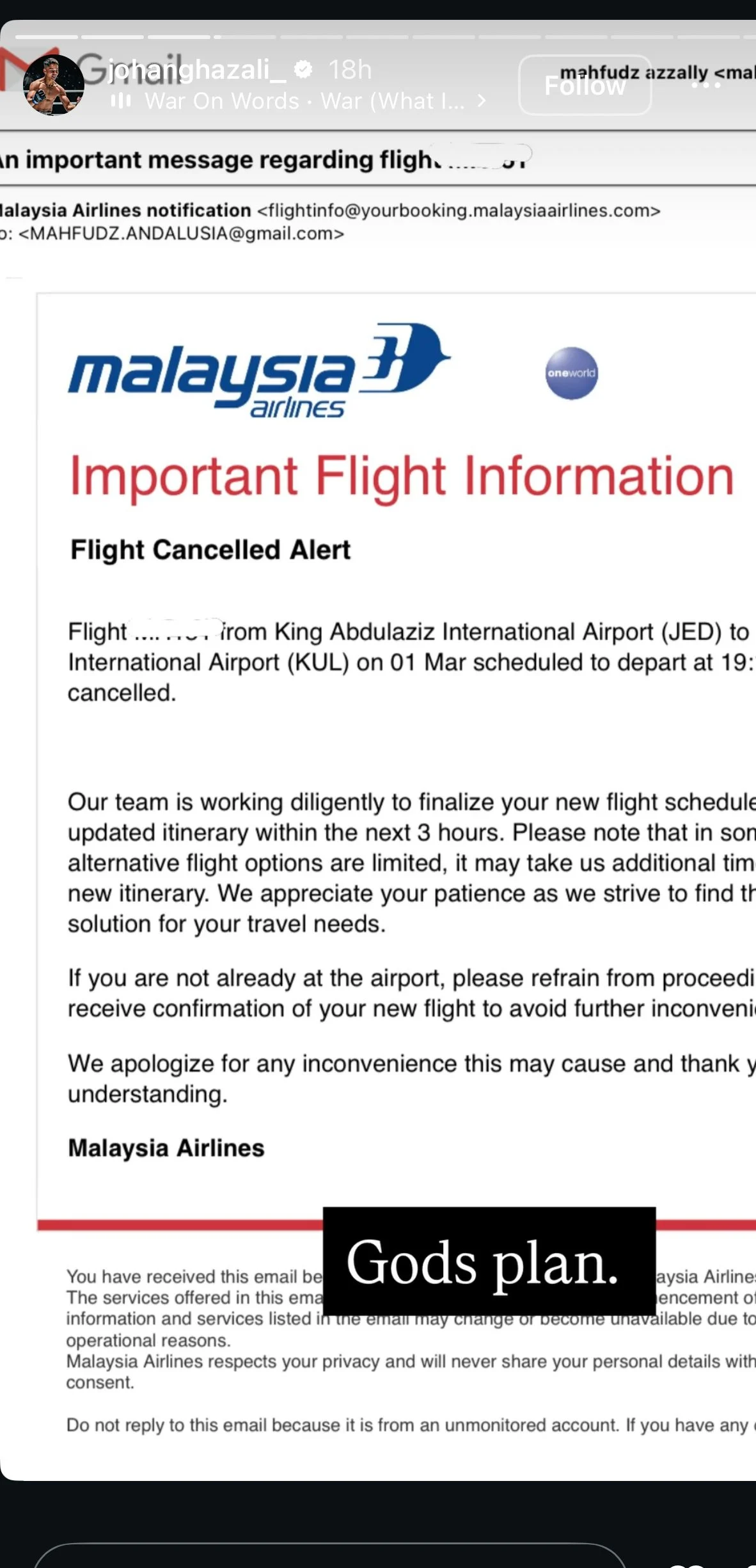 Jojo turut memuat naik emel memaklumkan pembatalan penerbangan dari Lapangan Terbang Antarabangsa King Abdul Aziz, Jeddah ke Lapangan Terbang Antarabangsa Kuala Lumpur.