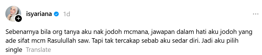 “Sebenarnya bila org tanya saya nak jodoh macam mana, jawapan dalam hati jodoh yang ada sifat macam Rasulullah SAW. Tapi tak tercakap sebab sedar diri. Jadi, saya pilih untuk single,” katanya.