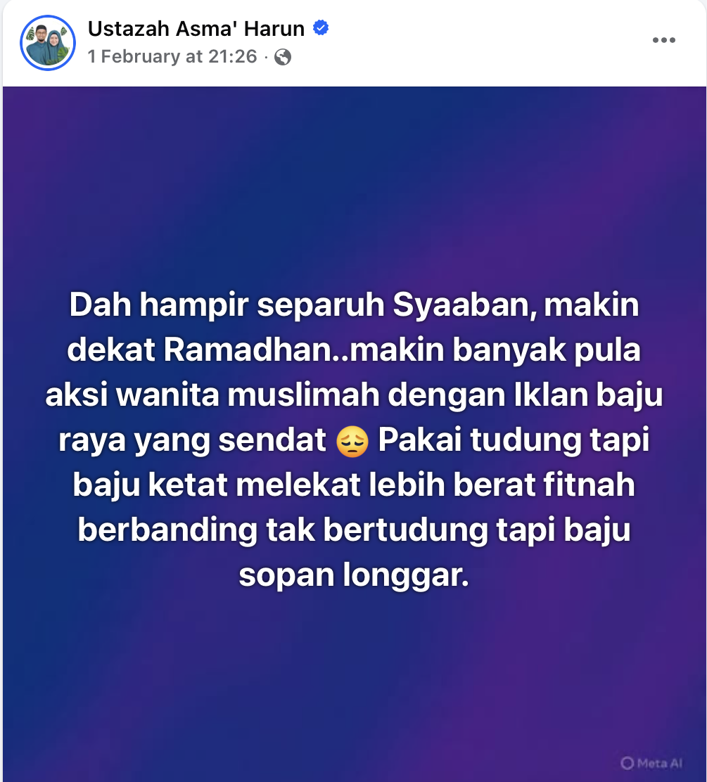 Sementara itu, Ustazah Asma turut menegur semakin ramai wanita Muslimah muncul dalam iklan baju raya namun mengenakan pakaian ketat apatah lagi bulan Ramadan semakin hampir.
