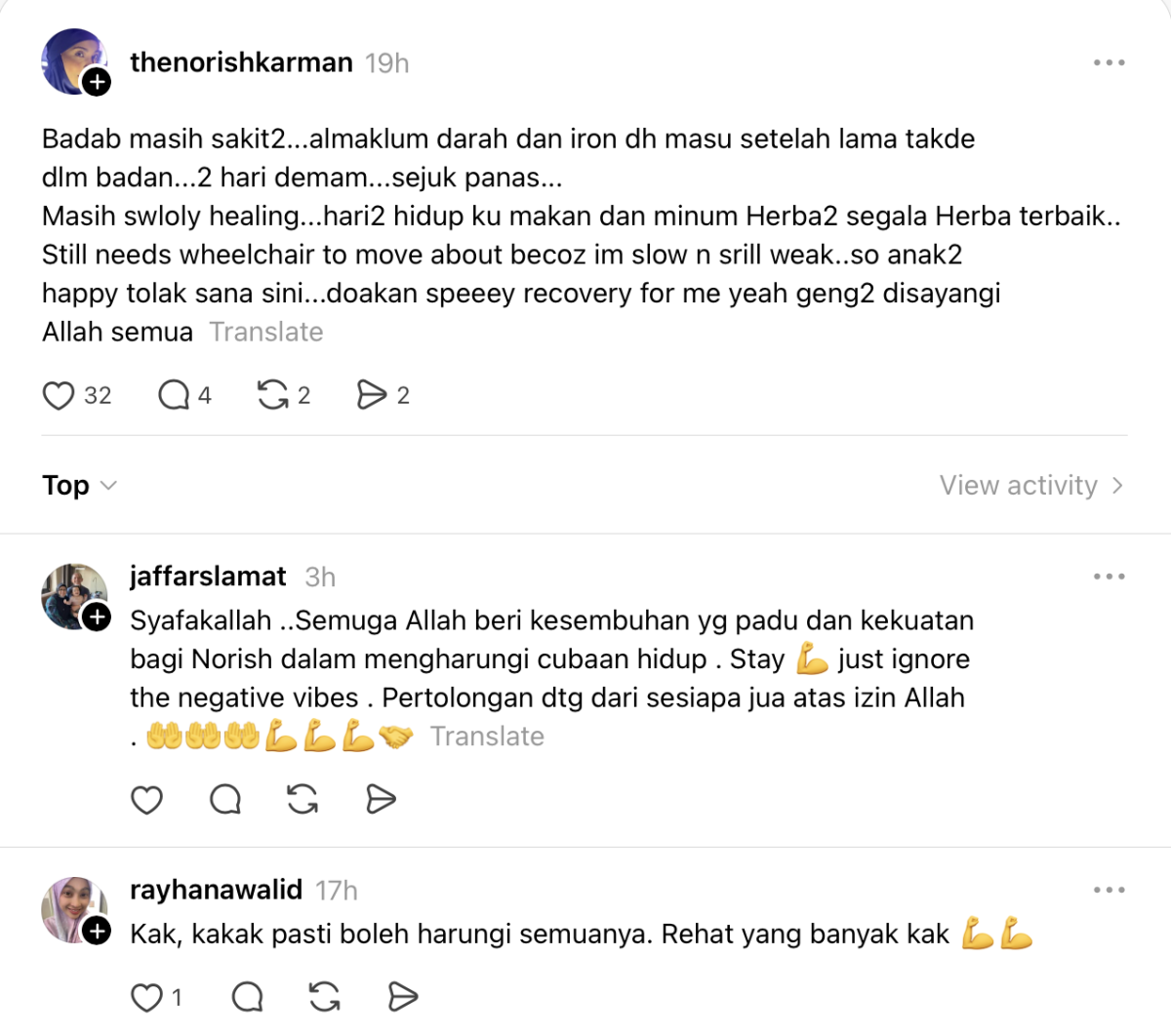 “Badan masih sakit-sakit, maklumlah darah dan zat besi sudah masuk selepas lama tiada dalam badan. Dua hari demam, sejuk panas. Masih perlahan-lahan untuk sembuh. Setiap hari hidup aku makan dan minum segala herba-herba terbaik,” tulisnya.