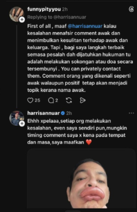 Individu berkenaan kemudian membuat permohonan maaf kepada Harris kerana menyalah tafsir hantarannya itu serta meminta untuk memberikan sokogan secara sembunyi dengan menghubungi mereka.