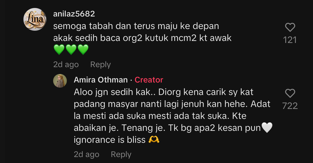 “Jangan sedih kak. Mereka kena cari saya dekat padang masyar nanti lagi jenuh kan hehe. Adat la mesti ada suka mesti ada tak suka. Kita abaikan saja. Tenang je. Tak bagi apa-apa kesan pun. Ignorance is bliss,” tulisnya.