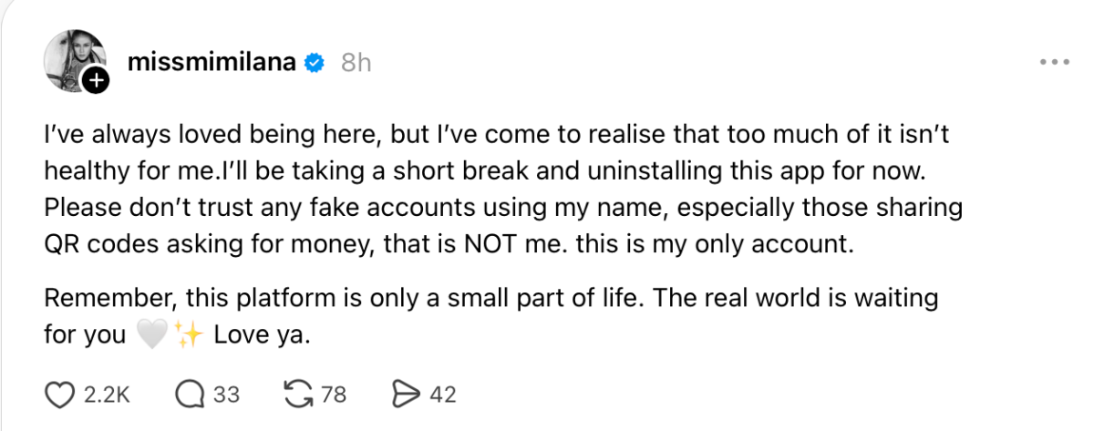 Pelakon Mimi Lana mengambil keputusan untuk berehat seketika daripada aplikasi Threads buat sementara waktu.