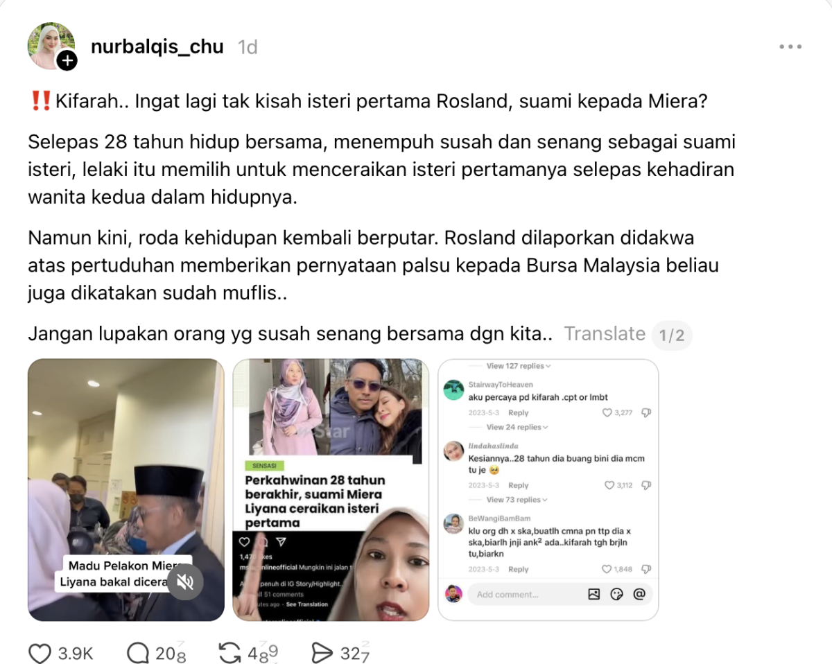 Menerusi satu perkongsian di Threads, seorang individu mendakwa ahli perniagaan itu memilih menceraikan isteri pertamanya selepas kehadiran wanita kedua dalam hidupnya.