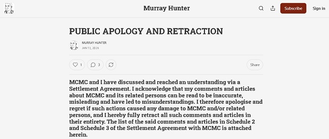 Blogger Murray Victor Hunter menarik balik sepenuhnya beberapa artikel yang didakwa berunsur fitnah terhadap Suruhanjaya Komunikasi dan Multimedia Malaysia (MCMC) serta memohon maaf selepas mencapai penyelesaian dengan suruhanjaya itu.