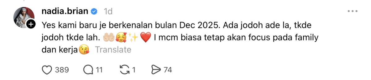 Menerusi satu komen balas di Threads, Nadia berkata dia dan Nedim baru saja berkenalan pada Disember tahun lalu.
