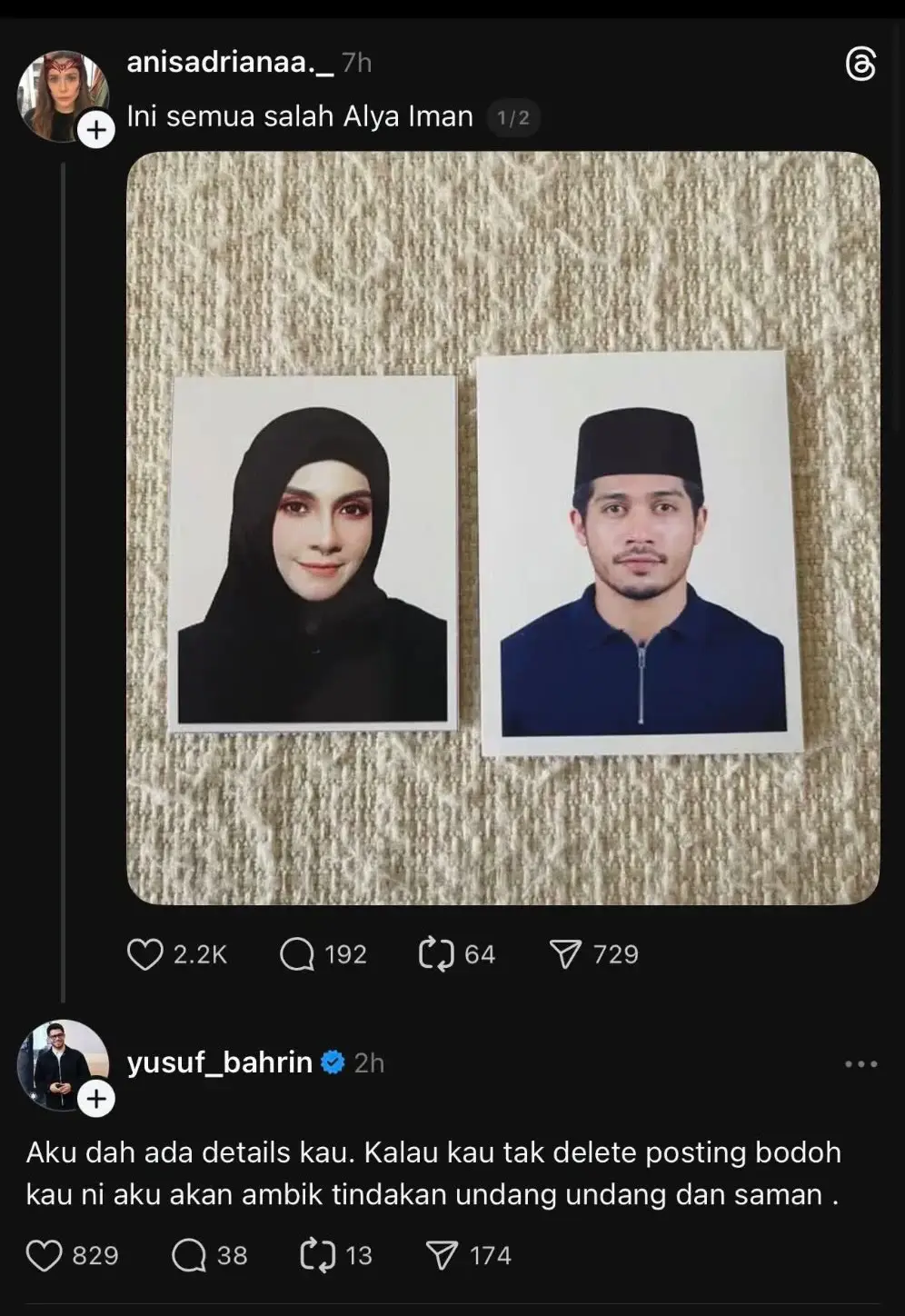 Menerusi hantaran di Threads, individu tersebut mendakwa Alya Iman seolah menjadi punca perceraian pasangan itu.