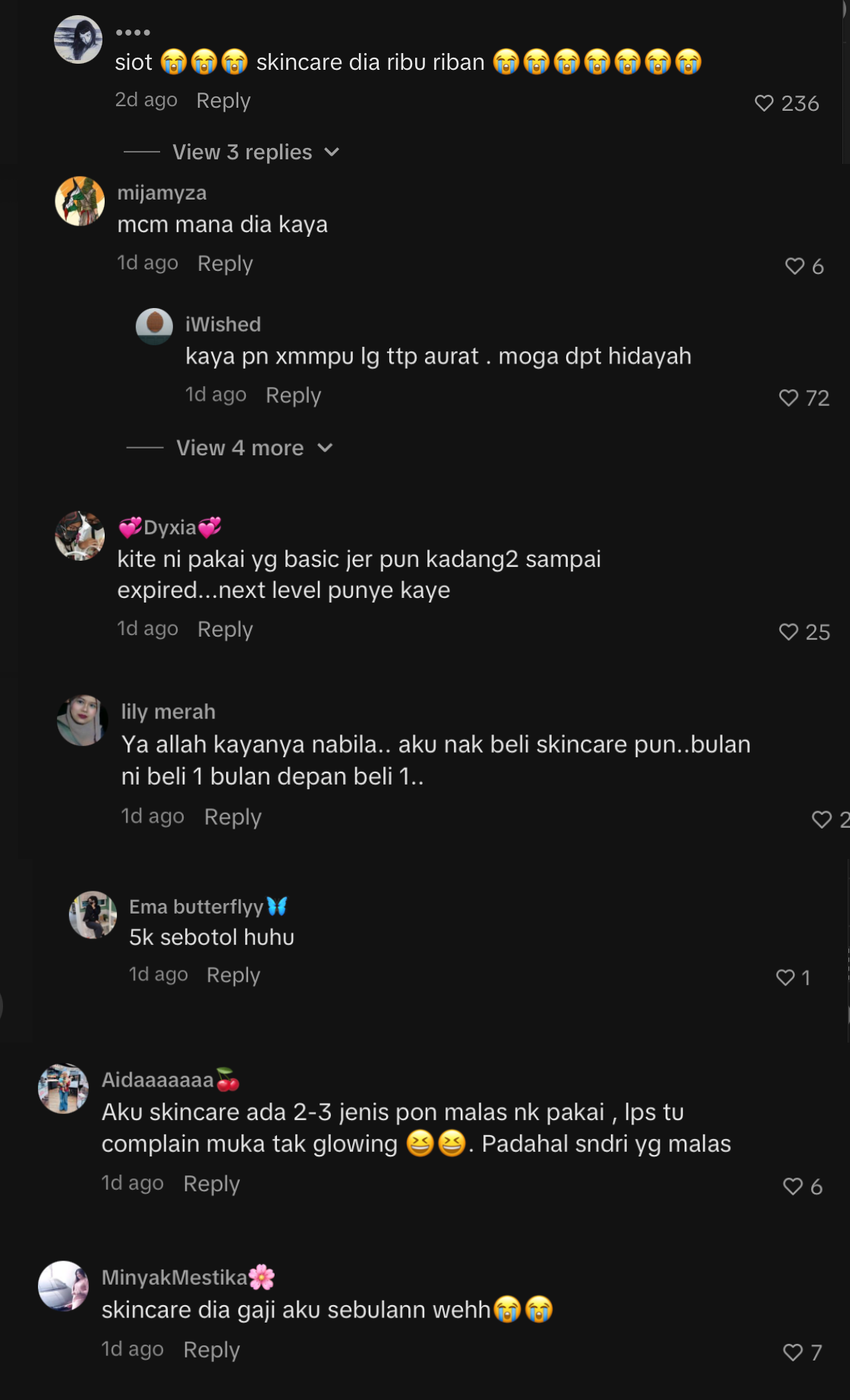Apa yang menjadi perhatian, diruangan komen ada netizen mendatakan kos sebotol produk yang digunakan Nabila mencecah ribuan ringgit.