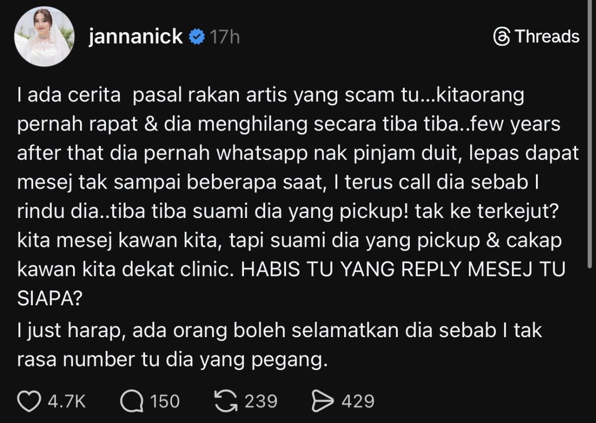 Menerusi perkongsian di Threads, Janna berkata pelakon itu menghantar mesej selepas beberapa tahun untuk meminjam wang namun dia merasa pelik kerana suami wanita itu yang menjawab panggilannya.