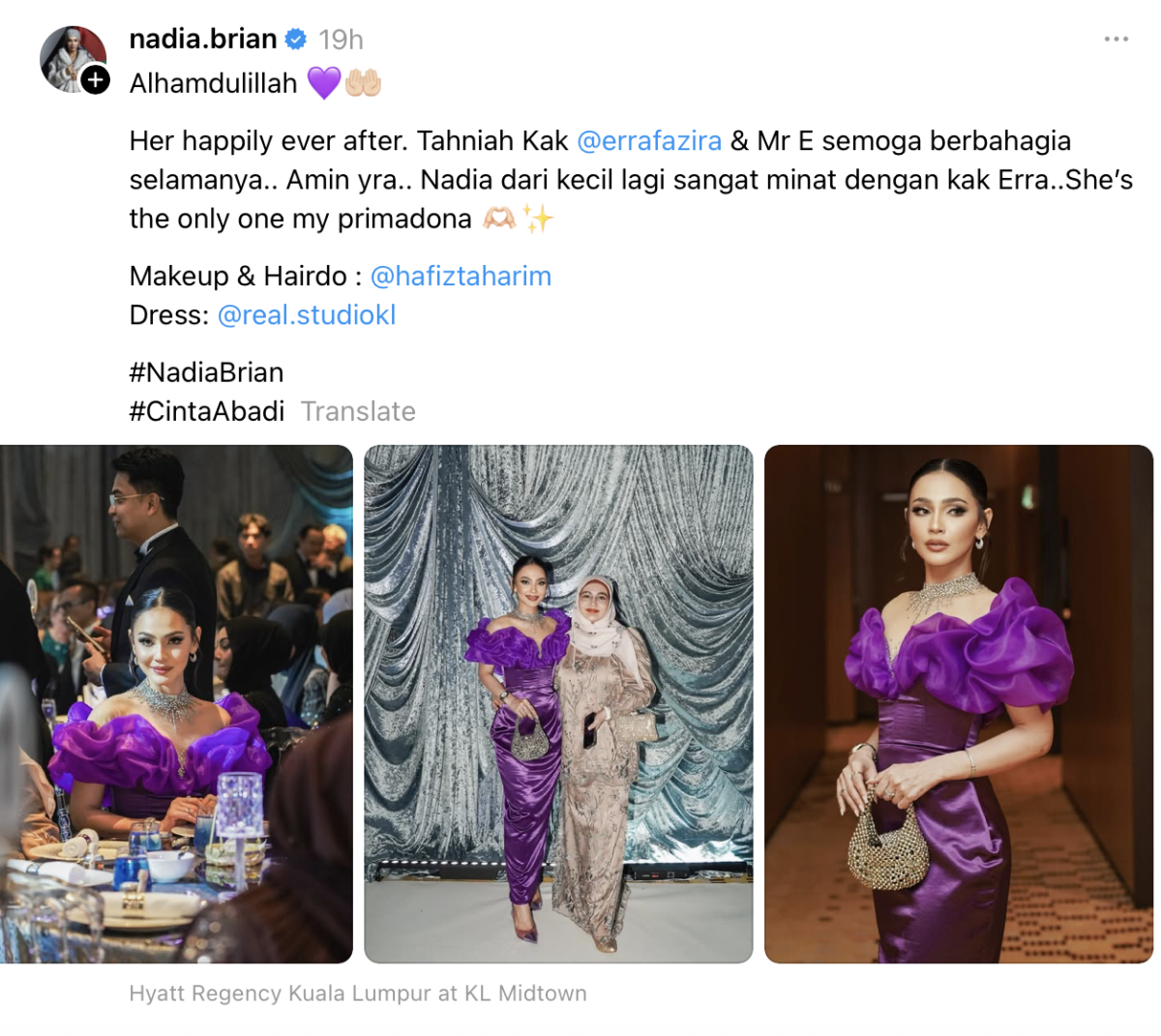 Menerusi laman Threads, Nadia dilihat memuat naik gambar menghadiri majlis Erra dan Ezwan mengenakan gaun berwarna ungu.