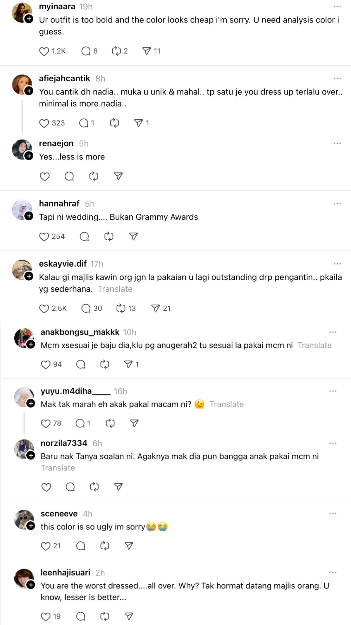 Diruangan komen, rata-rata netizen mengatakan Nadia kelihatan cantik namun mendakwa busana yang digayakannya agak berlebihan.