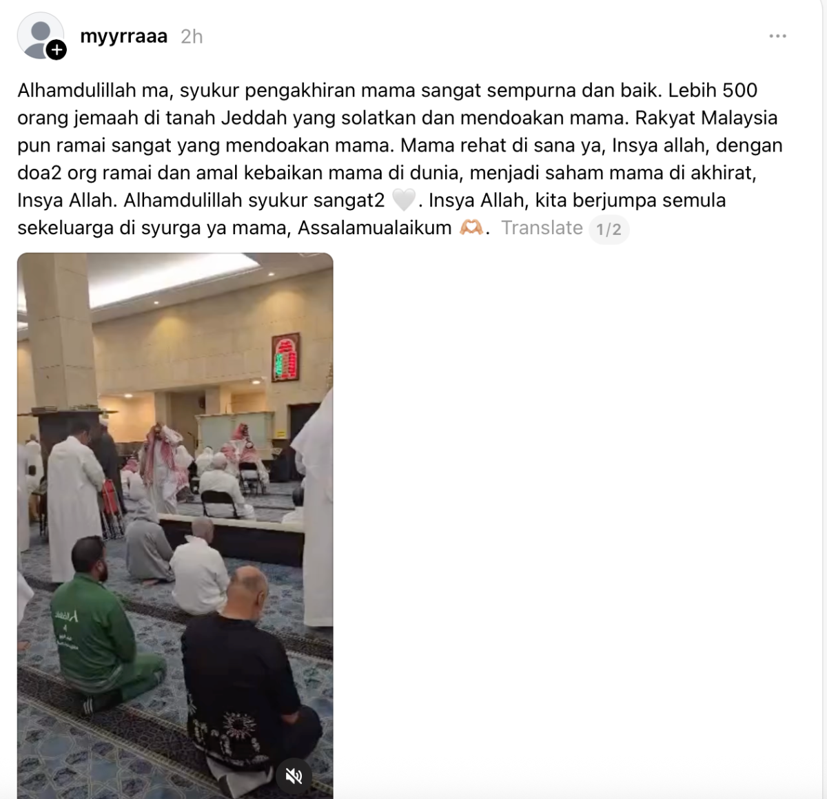 “Alhamdulillah, syukur pengakhiran mama sangat sempurna dan baik. Lebih 500 orang jemaah di tanah Jeddah yang solatkan dan mendoakan mama. Rakyat Malaysia pun ramai sangat yang mendoakan mama,” tulisnya.